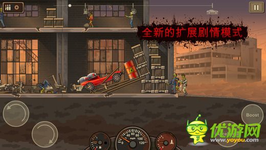 全新的劇情模式:Earn to Die 2 引入了宏偉的劇情模式,長(zhǎng)度是前作的五倍。游戲拋棄了熟悉的沙漠環(huán)境設(shè)定,而轉(zhuǎn)入了被僵尸感染的城市深處。