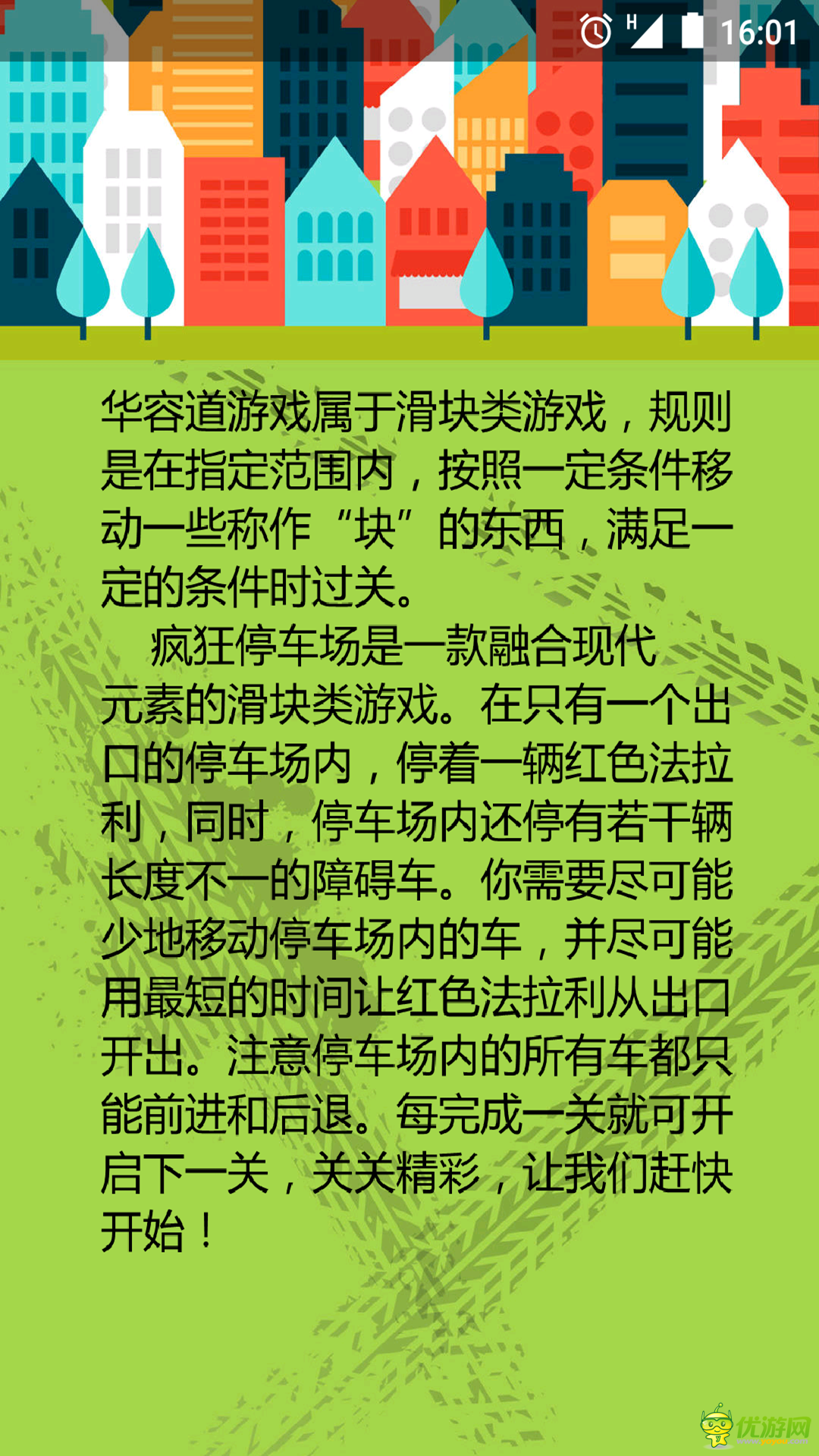 《瘋狂停車場(chǎng)》是一款融合現(xiàn)代元素的滑塊類游戲.在只有一個(gè)出口的停車場(chǎng)內(nèi),停著一輛紅色法拉利,同時(shí),停車場(chǎng)內(nèi)還停有若干輛長(zhǎng)度不一的障礙車.你需要盡可能少的移動(dòng)停車場(chǎng)內(nèi)的車,并盡可能用最短的時(shí)間讓紅色法拉利從出口開(kāi)出.注意停車場(chǎng)內(nèi)的所有車都只能前進(jìn)和后退.每完成一關(guān)就可開(kāi)啟下一關(guān),關(guān)關(guān)精彩。