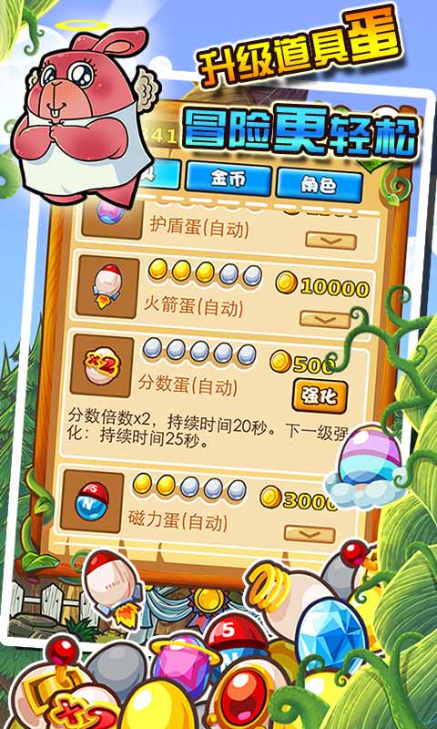 跳>>晃手機(jī);跳>>吃金幣;跳>>踩敵人;跳>>集彩蛋!極簡(jiǎn)便的重力感應(yīng)單手操作,帶來無限的成就感與快樂!不管你是高手還是小白,都能在蛋與藤的暢快游戲中得到無窮的樂趣!