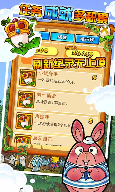 好奇心旺盛的兔子艾吉這回鉆進(jìn)了魔術(shù)師的小丑盒里,再出來的時(shí)候發(fā)現(xiàn)自己被彈到了一根鉆天的巨藤上。艾吉好奇的想知道巨藤的頂端 有什么,于是勇敢地踩著巨藤的葉片一直向上。當(dāng)心哦艾吉,向上的路途并不輕松。能否在各種蛋的幫助下登上頂端,一切就看你的了!