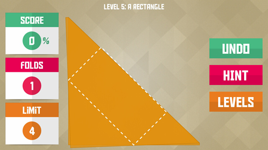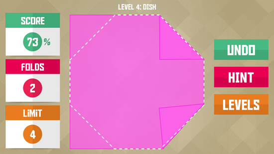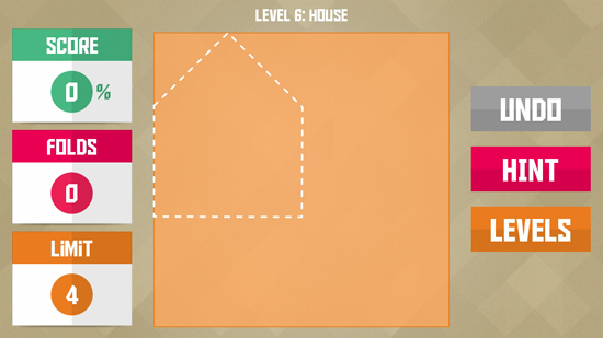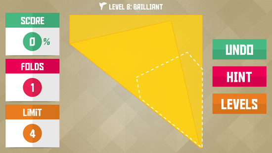 《智慧折紙》這款游戲制作非常精良,在畫(huà)面上處處可以體現(xiàn)出紙?jiān)氐拇嬖?。游戲在各個(gè)界面之間的切換全部采用翻頁(yè)效果,仿佛是一本正在翻動(dòng)的書(shū)籍向我們講述著折紙的智慧。進(jìn)入游戲,你會(huì)發(fā)現(xiàn)游戲中對(duì)于“紙”的刻畫(huà)體現(xiàn)的非常形象,只需一個(gè)手指就可完成各種折疊的動(dòng)作,首先將手指放到需要折疊的位置然后輕輕的滑動(dòng),紙就會(huì)隨著玩家的操作不斷變化著形狀,甚至操作起來(lái)比現(xiàn)實(shí)中的紙還要容易。在每個(gè)關(guān)卡中,游戲會(huì)提前將需要玩家折疊出的形狀以白色虛線的形式表現(xiàn)在紙上,接下來(lái)就要看玩家的思考能力了,關(guān)鍵之處在于游戲規(guī)定出了折紙的步數(shù),只要在規(guī)定的步數(shù)中折出游戲要求的圖形才能獲得成功,怎么樣,不容易吧?不過(guò)還好,游戲提供了撤銷操作按鍵,感覺(jué)折的方式不正確可以進(jìn)行撤銷操作返回到前面的步驟中去?!吨腔壅奂垺吠瑯右蔡峁┯刑崾竟δ?,通過(guò)提示按鍵可以看到下一步的游戲操作,不過(guò)這個(gè)功能只限前幾次使用,機(jī)會(huì)用完后就要進(jìn)行充值才能享受到提示了,非常的掃興。