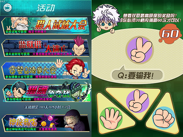 全職獵人是當(dāng)下最后的日本漫畫之一,天天獵人較好的還原的漫畫原作,畫面精致,看到這個畫面小編真的想說,美工,你加入我們吧!游戲人物Q萌,劇情精彩,包含各種玩法,不會只是單純的刷圖pk,連劃拳都有,這是要斗酒嗎?絕對好玩的游戲,誰試哈誰知道!