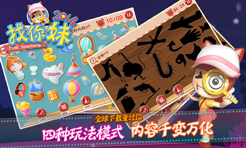 《找你妹2014》游戲延續(xù)“找物品”的核心玩法,融合RPG游戲元素。玩家在尋找妹妹的過程中,展開一系列冒險(xiǎn),經(jīng)歷“你妹飯店”、“夢幻海底”、“古墓迷蹤”、“無盡宇宙”等數(shù)十種特色各異的場景,可使用上百種趣味道具,如“原子彈”,“慶豐包子”,“藍(lán)屏按鈕”等等,無數(shù)精心雕琢的細(xì)節(jié)和游戲難度、玩法的轉(zhuǎn)換,給予玩家持續(xù)不斷驚喜感和新鮮感,使玩家樂在其中。玩法中還新增了獎(jiǎng)勵(lì)模式、安檢模式、數(shù)字模式、輪廓模式4種游戲模式,以更加自由便捷操作、精美清新的畫風(fēng)和詼諧動(dòng)人的故事情節(jié),將風(fēng)靡全球大找茬風(fēng)暴再次點(diǎn)燃。