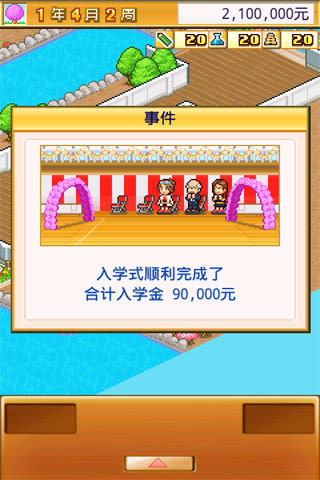 《名門(mén)口袋學(xué)院2》依然保持了Kairosoft一貫的2D畫(huà)面風(fēng)格,雖然整體的視覺(jué)感挺舒服的,不過(guò)老是這樣風(fēng)格的畫(huà)面時(shí)間長(zhǎng)了難免會(huì)有玩家覺(jué)得厭倦。所幸的是這回的《名門(mén)口袋學(xué)院2》增加了不同學(xué)院環(huán)境場(chǎng)景,例如普通的平原、臨湖學(xué)校和山間學(xué)校等,讓環(huán)境場(chǎng)景有所變化。游戲的音樂(lè)相當(dāng)?shù)钠蚴婢彽娘L(fēng)格,不過(guò)聽(tīng)起來(lái)的感覺(jué)實(shí)在有點(diǎn)讓人昏昏欲睡,不過(guò)喜歡開(kāi)羅游戲的玩家還是不要錯(cuò)過(guò)啦。