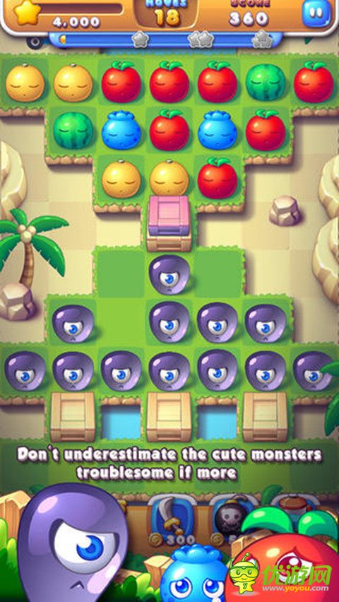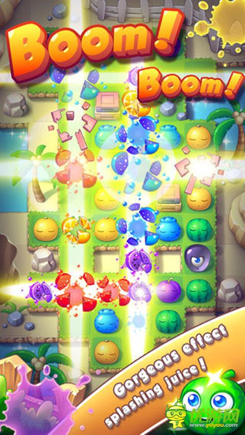 一款水果三消休閑游戲,不同的是只要可以連接起來可以一次消除多個,可惟刪除定時炸彈,華麗的畫面,清晰的泥漿,還有障礙,還是點難度的,你能每個級別都能拿到三個星嗎?