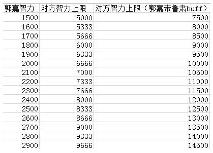 公式說明:對方智力上限,是指弱化對象智力小于等于該數(shù)值,那么郭嘉雙弱可以達到弱化時間上限。