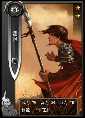 潘鳳作為黑卡一般都被當作狗糧,被大家忽視。但是潘鳳的技能很逆天啊有木有!??!高武力配上武力翻倍的技能簡直不能看?。。?!