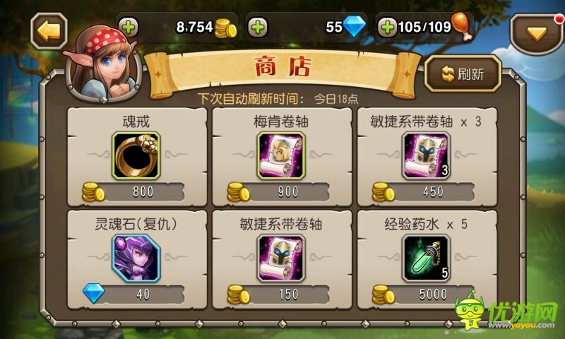 8.關于商店,包括普通商店,地精商店,黑市商人,遠征商店,競技場商店。普通商店刷新時間應該記好,前期有錢的時候可以是裝備都買,花金幣買的靈魂石并且英雄有用的也買,經(jīng)驗藥水什么的可以根據(jù)自己的需求買或者不買,等商店刷新已經(jīng)是我每天特別在意的事情了,有時候出一些裝備,買了省下好大功夫,不用去苦逼刷圖。只要庫存不到10件的我覺得都可以買干凈,畢竟還會有新的英雄或者進階以后還需要。還有就是多余的還可以拿去附魔。說道附魔,也就是盡量附魔一些對于英雄技能或者生存能力的物件,而且最好是給那些在競技場打拼的五人組。地精商店和黑市商人都是看人品刷出來的,地精出現(xiàn)好多次了,東西比普通商店賣的要高級一些,很多花金幣的都買了吧,而鉆石的就慎重考慮了,畢竟40鉆換一個英雄碎片還是有點貴,黑市商人還沒遇到過,其實也就是更加升級版,看網(wǎng)上發(fā)的截圖,感覺大部分都是花鉆石的,估計刷出來我也不會買什么。遠征商店和競技場商店里的東西都是靠積分換,晚上9點刷新,如果積分夠多,而且英雄馬上可以換出來了,建議可以用10甚至50分刷新幾下,100的就算了,我覺得競技場的分更珍貴。