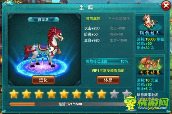 《戰(zhàn)仙》騎寵系統(tǒng)開啟后我們獲得的騎寵可以通過培養(yǎng)來提升所加成的屬性和移動(dòng)速度,每日都可以可使用元寶和銅錢進(jìn)行騎寵培養(yǎng),培養(yǎng)星級(jí)。達(dá)到一定等級(jí)后可以進(jìn)化,進(jìn)化可獲得更帥氣的造型和提升可享有騎寵加成屬性的上限!頂級(jí)坐騎燭龍等等都需要通過培養(yǎng)來獲取,高級(jí)騎寵不光外形酷帥,實(shí)力也是超強(qiáng)的,得到后有種瞬間屌絲變高富帥的小激動(dòng)啊,哈哈!這時(shí)候的騎寵也會(huì)瞬間變身把妹神器!