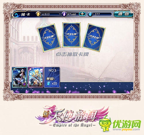 《新天使帝國》的抽卡形式與傳統(tǒng)卡牌游戲的“十連抽”形式徑庭。傳統(tǒng)卡牌十連抽系統(tǒng)完全依靠運氣,切過程中會產(chǎn)生大量廢卡,浪費掉大量資源。而《新天使帝國》中的抽卡系統(tǒng)以“半透明”的形式進行。玩家每次抽卡將會從五張背面朝上的卡牌中選擇,選擇完畢后,系統(tǒng)會亮出其余四張,玩家有兩次繼續(xù)抽取剩余人物。也就是說分別有25%和33%的幾率抽到想要的人物。反之,若亮出的卡牌中沒有需要的人物,則可以重新開始,從而避免產(chǎn)生不必要的消耗。