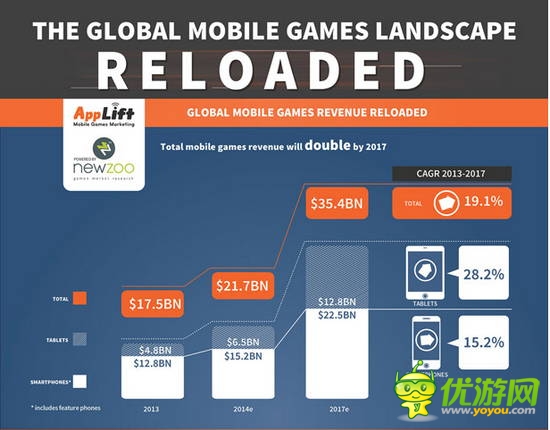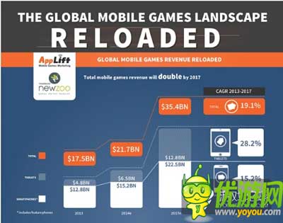 今日,移動(dòng)游戲營(yíng)銷機(jī)構(gòu)AppLift和荷蘭市場(chǎng)研究公司Newzoo今晨聯(lián)合發(fā)布了一份最新報(bào)告。報(bào)告預(yù)計(jì),至2017年,全球移動(dòng)游戲收入規(guī)模將從2013